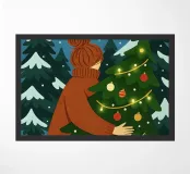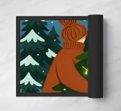 Simpatica arte natalizia stravagante di una donna che trasporta il suo albero di Natale in una foresta innevata. L'albero di Natale è illuminato da luci fatate.