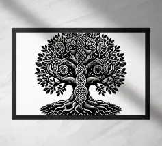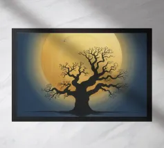Questa silhouette mostra un albero nodoso e consumato dalle intemperie, con fili di muschio pendenti su cui sono appollaiati diversi corvi. Due lanterne pendono dai rami, mentre i pipistrelli volano sullo sfondo. Il disegno trasmette un'atmosfera misteriosa e un po' cupa che ricorda vecchie leggende o mondi fantastici. Ideale per gli appassionati di stile gotico, estetica fiabesca o decorazioni di Halloween. Il contrasto minimalista tra il nero e lo sfondo chiaro aumenta l'effetto drammatico.