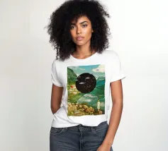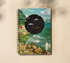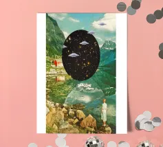 Alieni nelle loro astronavi UFO che cambiano dimensione dallo spazio esterno a un villaggio tra le montagne in Norvegia. Una donna retrò degli anni '50 osserva il fenomeno, sperando di non essere rapita. Surreale collage di arte fantascientifica retrofutura di MsGonzalez.