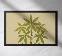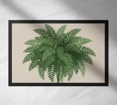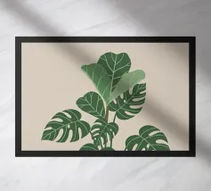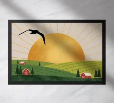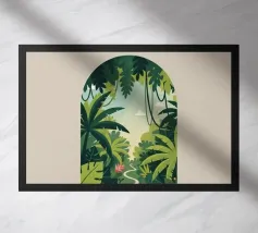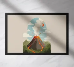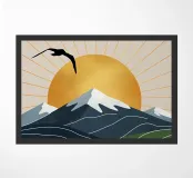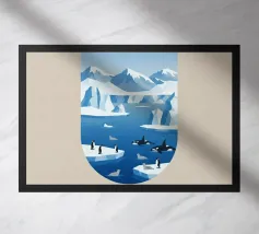 Un'illustrazione splendidamente stratificata e minimalista che presenta una maestosa catena montuosa innevata e i pendii inferiori ondulati, racchiusi in una forma astratta a goccia. Il disegno utilizza colori naturali e tenui e sottolinea i contorni sereni del paesaggio selvaggio.