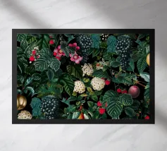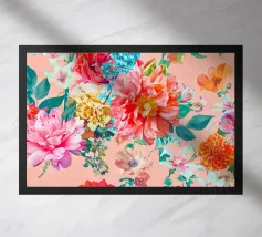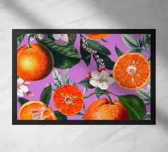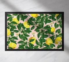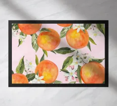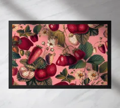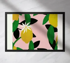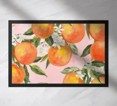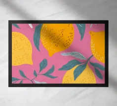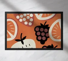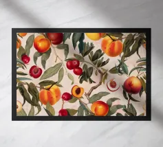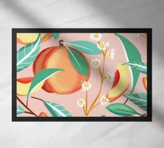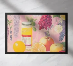 Un collage colorato di frutta fresca e fiori di ciliegio in tenui colori pastello che dà vita all'estate su uno sfondo rosa. Ideale per gli amanti del mercato della frutta e della natura!