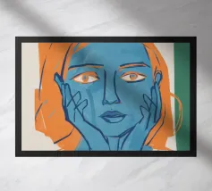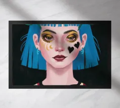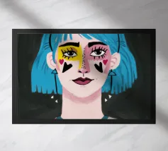 Ritratto moderno e artistico di una donna con capelli corti blu e camicia a righe arancioni e bianche. Il suo sguardo diretto e riflessivo e i colori decisi creano un'immagine suggestiva e memorabile.