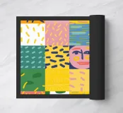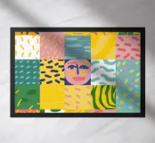 Una composizione astratta vibrante ed energica con un volto stilizzato integrato in un patchwork colorato di motivi geometrici. L'opera è un'esplorazione moderna e giocosa dell'identità e della forma.