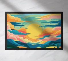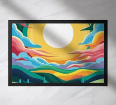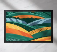 Un paesaggio vibrante e stilizzato di colline verdi e blu sotto un'alba colorata e radiosa, che evoca un senso di speranza, ottimismo e la bellezza di un nuovo giorno.