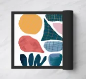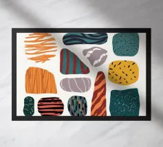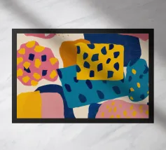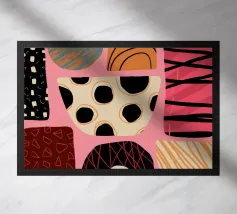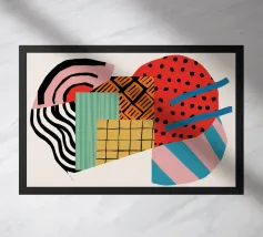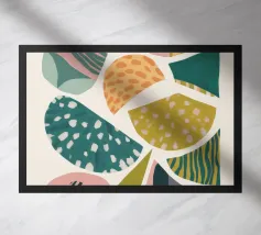 Una composizione astratta di forme assemblate con varie texture e motivi, tra cui griglie e punti. La sofisticata palette di colori e la disposizione equilibrata le conferiscono un'atmosfera da metà secolo moderno.