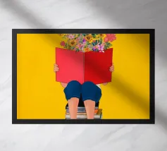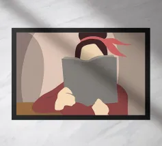Ritratto di una persona con un taglio di capelli nero a caschetto, completamente assorta nel libro verde che sta leggendo. Lo stile senza volto focalizza l'attenzione dello spettatore sull'atto della lettura e sulla tranquilla contemplazione.