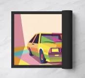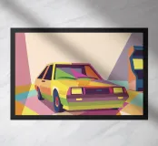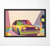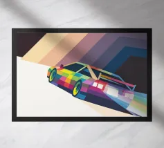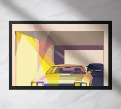 Illustrazione di un'auto in stile geometrico moderno in una sala giochi.
