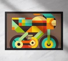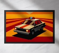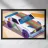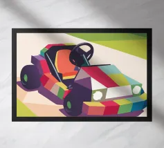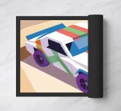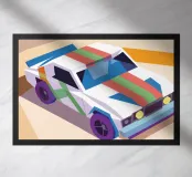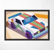 Illustrazione di un'auto da corsa bianca con strisce colorate sulla pista con uno stile geometrico moderno.