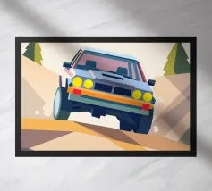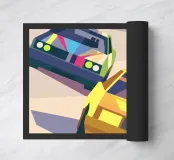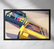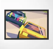 Illustrazione di due auto da corsa che si sfidano in pista con uno stile geometrico dinamico.