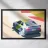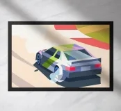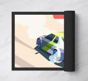 Illustrazione di un'auto che derapa in pista con uno stile geometrico e dinamico.
