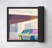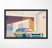 Illustrazione di un'auto in un garage con uno stile geometrico moderno. Perfetta per poster, decorazioni di ambienti o materiale promozionale a tema automobilistico e domestico.