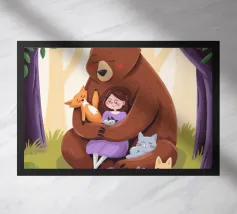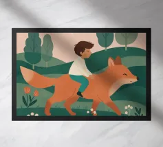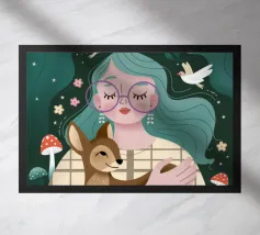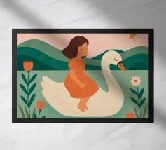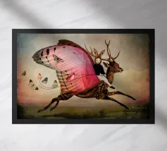 Un cavaliere intraprende un viaggio in cima a un maestoso cervo attraverso un paesaggio innevato. Le montagne lontane scintillano sotto un fresco cielo crepuscolare, evocando avventura e tranquillità.
