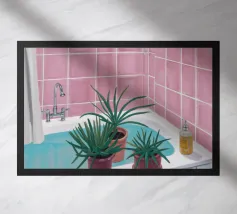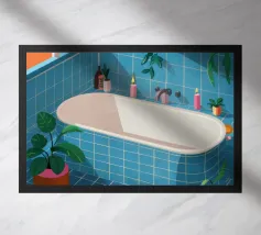 Una scena di bagno luminosa e pulita con piastrelle verdi, una vasca da bagno bianca e uno specchio che riflette ancora di più lo spazio vibrante. La stanza è piena di luce e crea un'atmosfera fresca, allegra e invitante.