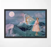 Elegante donna degli anni '60 che si trasforma in farfalla, iniziando a farsi crescere un paio di ali colorate. Sfondo concettuale di montagne innevate, luna piena e alcune formule matematiche (la scienza della sua trasformazione). Collage originale surreale di arte retrò di MsGonzalez
