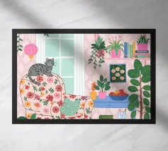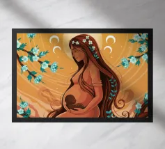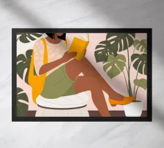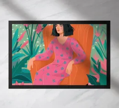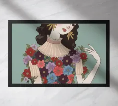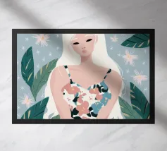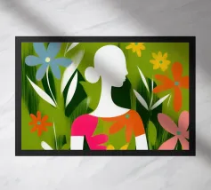 Avvolta da motivi floreali, una figura si erge con grazia tra la vegetazione lussureggiante. Foglie vibranti e petali rigogliosi incorniciano la loro silhouette, formando un ipnotico tableau naturale.
