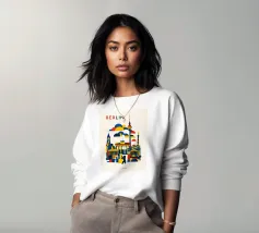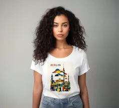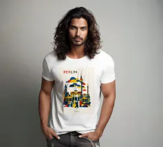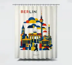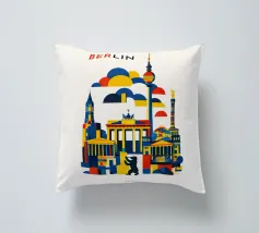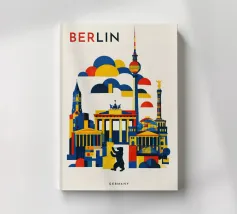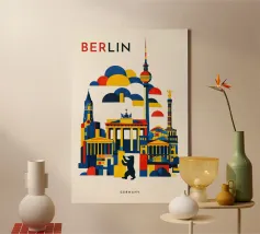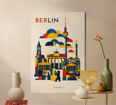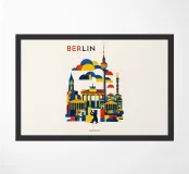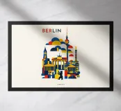 Bold, graphic and instantly recognisable, this Berlin art print captures the spirit of Germany’s capital through a striking geometric composition. Iconic landmarks including the Brandenburg Gate, Fernsehturm TV Tower, Victory Column and the Berlin Bear are reimagined in clean architectural forms and layered shapes. A confident palette of deep blue, vibrant red and warm yellow brings energy and contrast, while soft cloud forms create depth and rhythm across the skyline. The minimalist typography and balanced layout give the piece a contemporary, gallery-ready feel.