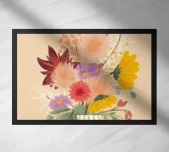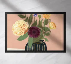 Una composizione moderna e grafica di fiori blu e gialli in un vaso a scacchi bianchi e neri. L'equilibrio tra il disegno audace e i fiori delicati crea un pezzo elegante e contemporaneo.