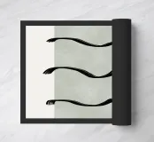 Opera d'arte astratta e moderna di forma rettangolare con pennellate e texture nere. Arte minimalista in verde salvia per uno stile di vita bohémien, bohémien, industriale, japandi e moderno.