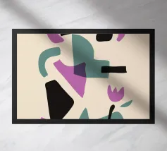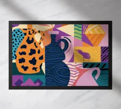 Forme audaci e astratte e colori vivaci formano una collezione di bottiglie e oggetti stilizzati, ognuno con un layout geometrico distinto. Le linee curve e le tonalità contrastanti creano un senso di movimento ed estrosità.