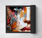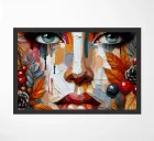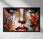A vibrant and textured portrait painting of a woman's face created in a style reminiscent of impasto painting, where thick layers of paint are applied to create a three-dimensional effect. The face is composed of various patches of colour in warm tones like oranges, reds, and browns, balanced by cooler shades like blue and grey.