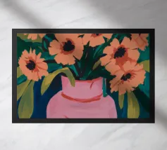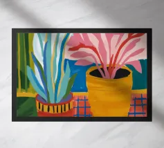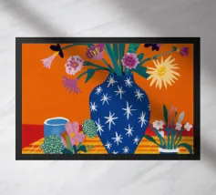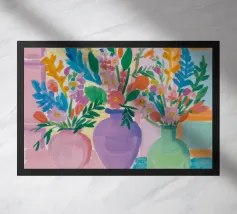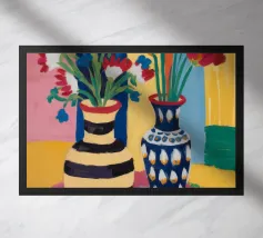 Una vibrante ed eclettica natura morta con un bouquet di fiori in due vasi con motivi diversi, uno a macchie e uno a ghirigori. La tovaglia a motivi aggiunge un mix gioioso e massimalista di colori e design.