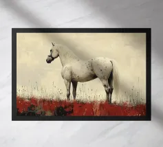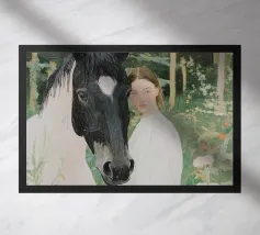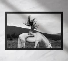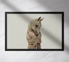 Un'immagine surreale in bianco e nero di una donna in abito di pizzo che si trova di fronte a una gigantesca testa di cavallo con texture screpolate, che crea un'atmosfera onirica e stimolante in un cielo nuvoloso.