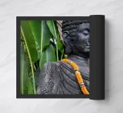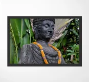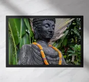 Una serena statua di Buddha, ornata da una tradizionale ghirlanda di calendule, siede pacificamente in mezzo al verde lussureggiante del Sahaja Resort di Bali. La pietra invecchiata, abbinata a vivaci piante tropicali, crea un senso di equilibrio, spiritualitĆ e tranquillitĆ .