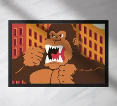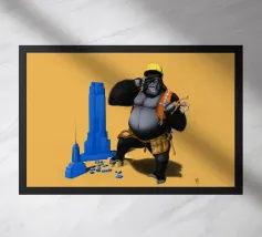Illustrazione comica di una parodia classica della storia di King Kong. Lo scimmione costruisce l'Empire State Building con i lego, ma non sa cosa fare con Barbie.