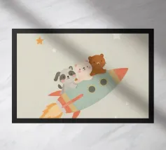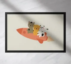 Una deliziosa illustrazione verticale con una squadra di estrosi coniglietti ingegneri che costruiscono un razzo colorato sotto un cielo da sogno. La scena è ricca di affascinanti dettagli costruttivi: scaffali, cianografie, secchi di vernice e lavoro di squadra in movimento. Perfetto per le stanze dei bambini o per le collezioni d'arte fantasiosa, questo pezzo invita gli spettatori a esplorare la gioia di costruire e sognare in grande.