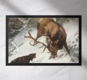 Un impressionante dipinto realistico mostra il drammatico incontro tra un possente cervo e un cane da caccia tra le montagne innevate. La scena cattura la tensione, la selvaticità e il dinamismo della caccia, magistralmente realizzata con luci e dettagli raffinati. Lo sfondo invernale con rocce e rami spogli enfatizza la drammaticità della situazione. Un classico motivo di caccia per gli amanti della pittura animale tradizionale e dell'arte naturalistica realistica.