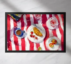 Una classica scena di colazione con un croissant su un piatto e una tazza di caffè con cannuccia a righe, su una tovaglia di percalle gialle. La composizione è calda e invitante, con un'atmosfera da caffè accogliente e senza tempo.