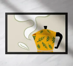 La classica caffettiera Moka è elegantemente presentata come un vaso che contiene una singola e delicata margherita bianca, unendo i rituali del caffè e la bellezza della natura in una natura morta minimalista.