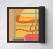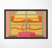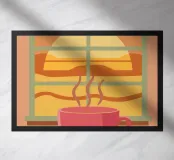 Un'illustrazione semplice e confortante di una tazza rosa di caffè o tè fumante, appoggiata a una finestra con vista sul sole che sorge. La scena cattura perfettamente il calore e la speranza di un nuovo mattino.