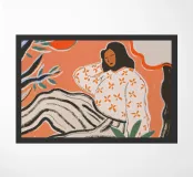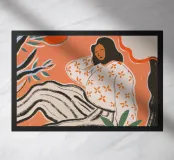 Una donna siede rilassata al centro di una luminosa tonalità di arancione. Il suo vestito a righe e il suo top floreale sembrano un mix di illustrazione di moda e arte moderna. Linee decise, colori caldi e un'ambientazione stilizzata fanno oscillare questo quadro tra serenità e forza. Una composizione che celebra la femminilità, la calma e la forza allo stesso tempo, ispirata alla grafica moderna e all'atmosfera mediterranea.