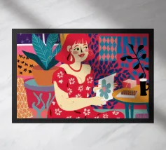 Illustrazione di una persona con una classica camicia a righe, immersa in un libro e circondata da rigogliose piante verdi. La scena è una rappresentazione pacifica, accogliente e intellettuale di un perfetto rifugio per la lettura.