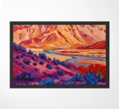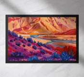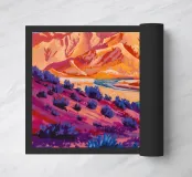 Un fiume si snoda attraverso un canyon dipinto in un prisma di colori vibranti e non naturalistici, con rossi infuocati, viola profondi e blu freddi che creano un paesaggio altamente espressivo e moderno.
