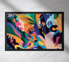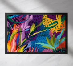 Un'esplosione caotica e cromatica di foglie colorate e sovrapposte crea un modello di giungla vibrante, energico e coinvolgente, pieno di vita e movimento.