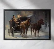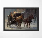 Questo suggestivo dipinto mostra una carrozza trainata da cavalli che percorre una strada innevata, mentre la calda luce delle lanterne illumina la sera. Il cocchiere, in spessi abiti invernali, guida i cavalli con calma nella notte gelida. Una scena piena di nostalgia, romanticismo e tranquillità invernale, che trasporta lo spettatore in un'epoca passata ricca di fascino e contemplazione.