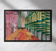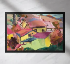 Un'energica veduta dall'alto cattura una cascata di tetti colorati, gialli, rossi e blu, che si contendono lo spazio. Il dipinto è una celebrazione vibrante, quasi astratta, della trama densa e vivace di una vecchia città.