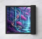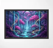 Cascata incantata al chiaro di luna. Un paesaggio surreale caratterizzato da cascate sotto una grande luna luminosa. Alberi di ciliegio in fiore con fogliame rosa vibrante arricchiscono la scena.
