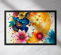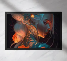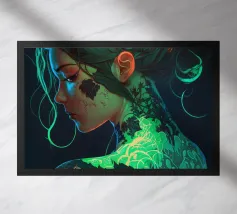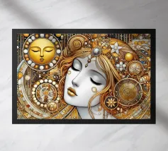 Uno squisito ritratto fantasy che unisce eleganza regale e simbolismo cosmico. La Sovrana Celeste raffigura una potente figura femminile adornata con un copricapo dorato e ornato da motivi lunari e celestiali. Nastri fluenti di turchese, oro e cremisi si intrecciano intorno a lei, creando un'aura radiosa di misticismo e forza. Una celebrazione della femminilità divina, dello stile art nouveau e dell'intricato artigianato digitale.