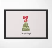 Disegno di un pino verde con neve e un fiocco rosso con citazione di Natale
