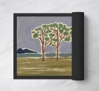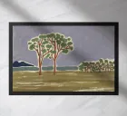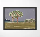 A simplistic landscape depicts a row of trees with green foliage against a stylized background featuring blue mountains and a swirling grey sky. The foreground is rendered in broad strokes of earthy colors, giving the impression of a grassy field or meadow.