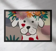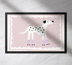 Una stampa d'arte audace e moderna con le zampe posteriori e la coda di un dalmata su un vivace sfondo rosa. Pesche arancioni stilizzate e linee curve aggiungono un tocco astratto e giocoso. Perfetta per gli amanti dei cani e per chi apprezza i disegni grafici unici.