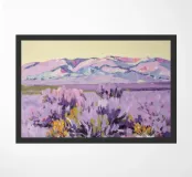 Colline ondulate ricoperte di una soffice e vaporosa lavanda si estendono verso una lontana e pallida catena montuosa. I colori delicati e la messa a fuoco morbida creano un paesaggio sognante, tranquillo e suggestivo.