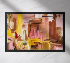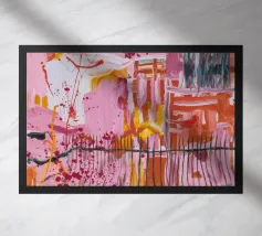 Una vibrante opera astratta con una collisione di forme colorate e a blocchi in rosa, arancione, giallo, nero e bianco, che suggerisce la natura energica e frammentata di un ambiente urbano. Stile Bob Nugent.