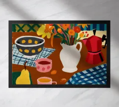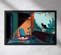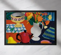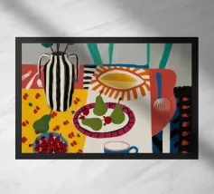 Un collage vibrante e caotico di motivi contrastanti, tra cui righe, pois e forme organiche. La gioiosa esplosione di colori e texture crea un'opera d'arte energica e piena di vita.