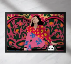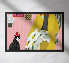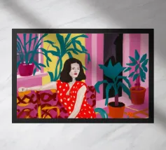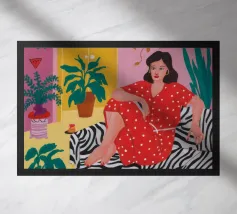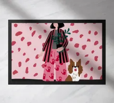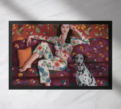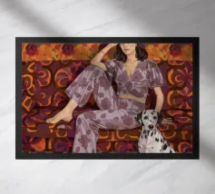 Una donna si trova in una cucina dai colori vivaci con un dalmata al suo fianco, una finestra che mostra una scena all'aperto e vari dettagli della cucina, creando un'illustrazione domestica eccentrica e affascinante.