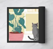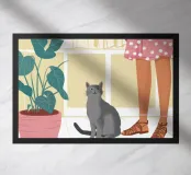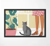 Una tranquilla scena domestica cattura un gatto grigio seduto pazientemente accanto alle gambe del suo padrone, mostrando un semplice e tenero momento di compagnia tra un umano e il suo amato animale domestico.