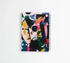 This artwork features an abstract composition with a mix of geometric shapes and vibrant colors such as pink, yellow, green, and black. The shapes are layered and create a sense of complexity.